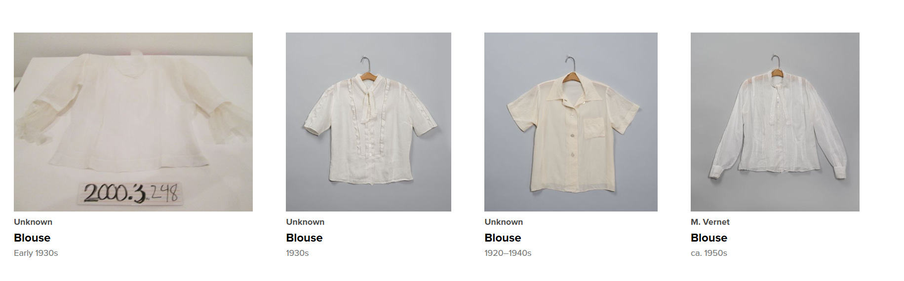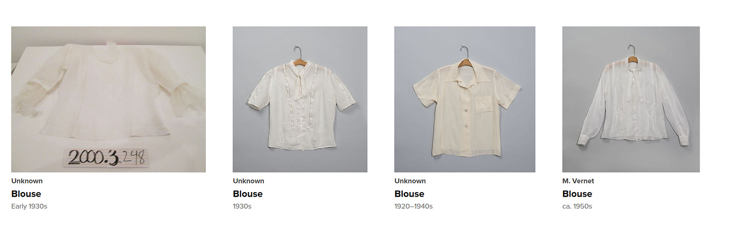 Sampler of Georgia O’Keeffe’s white blouses, via the Georgia O’Keeffe Museum’s online collection.